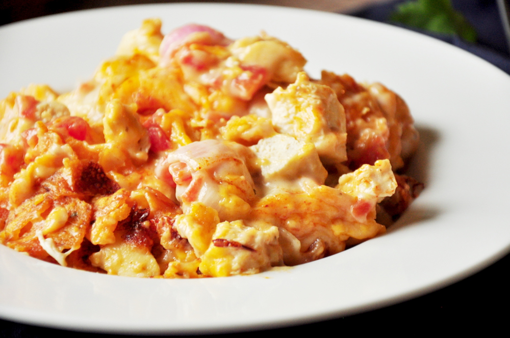 Steam or boil the chicken breasts until cooked through (I use my steamer and find it makes the chicken perfectly moist and tender). When cool, dice into bite-size pieces. In a large saucepan over medium heat, mix the soups, onion, Ro-tel tomatoes and Cheez Whiz until blended. Preheat oven to 350 degrees Farenheit. Layer the bottom of a greased 9x12 casserole dish with crushed chips. Next, layer half the chicken pieces. Top with half the sauce. Sprinkle with half the cheddar cheese. Repeat the layers, but top with the Cheddar and Mozzarella. Sprinkle paprika over the top to garnish. Bake for 30-45 minutes, or until hot and bubbly.