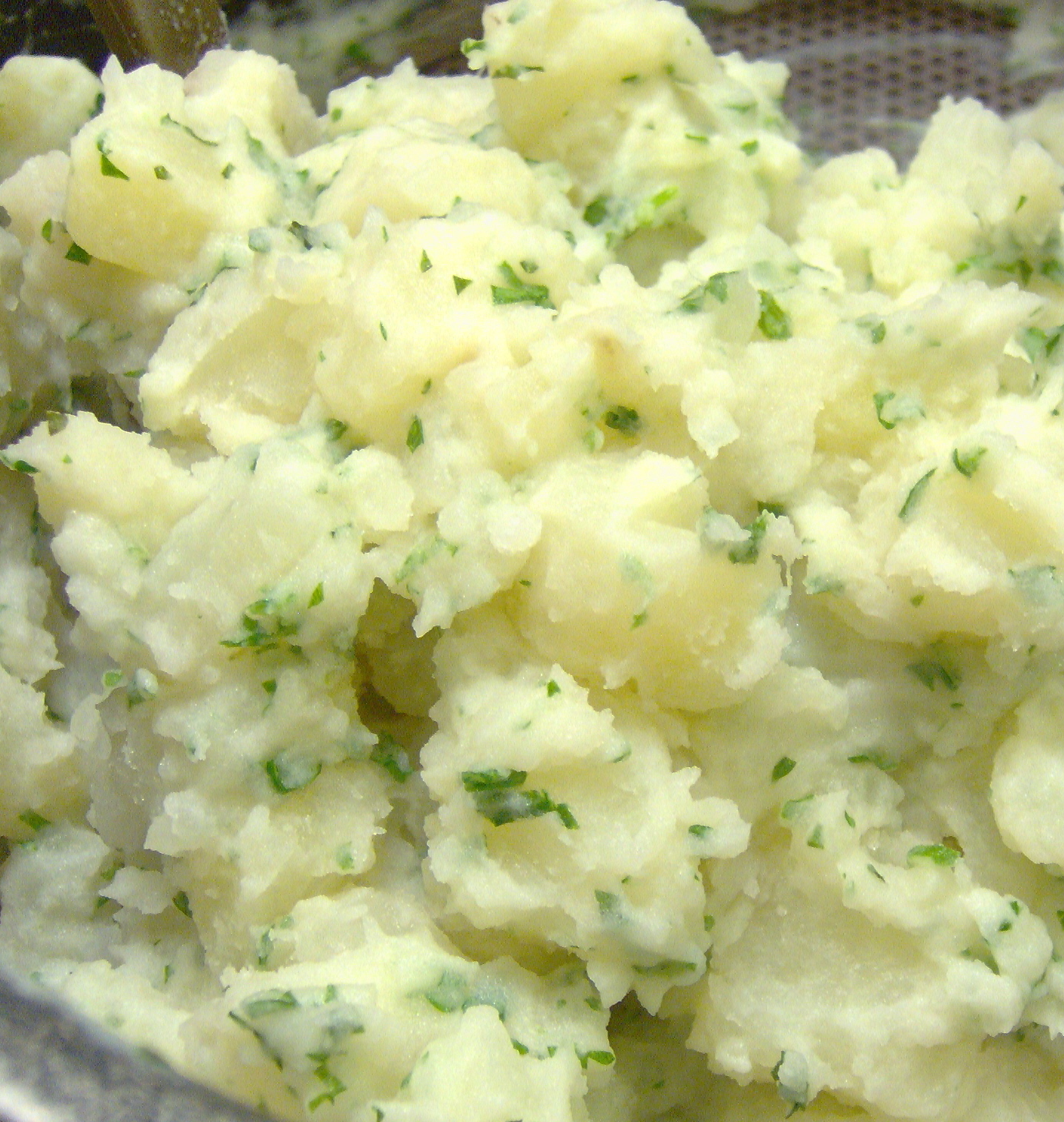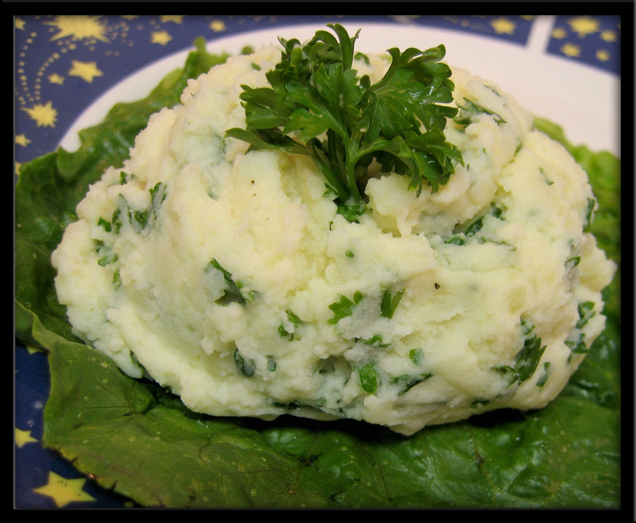 5 medium potatoes (White or Red) 1?2 cup sour cream 1?8 - 1?4 cup fresh parsley (Adjust to your liking) 3 tablespoons butter 1 teaspoon garlic powder 1?2 teaspoon salt
