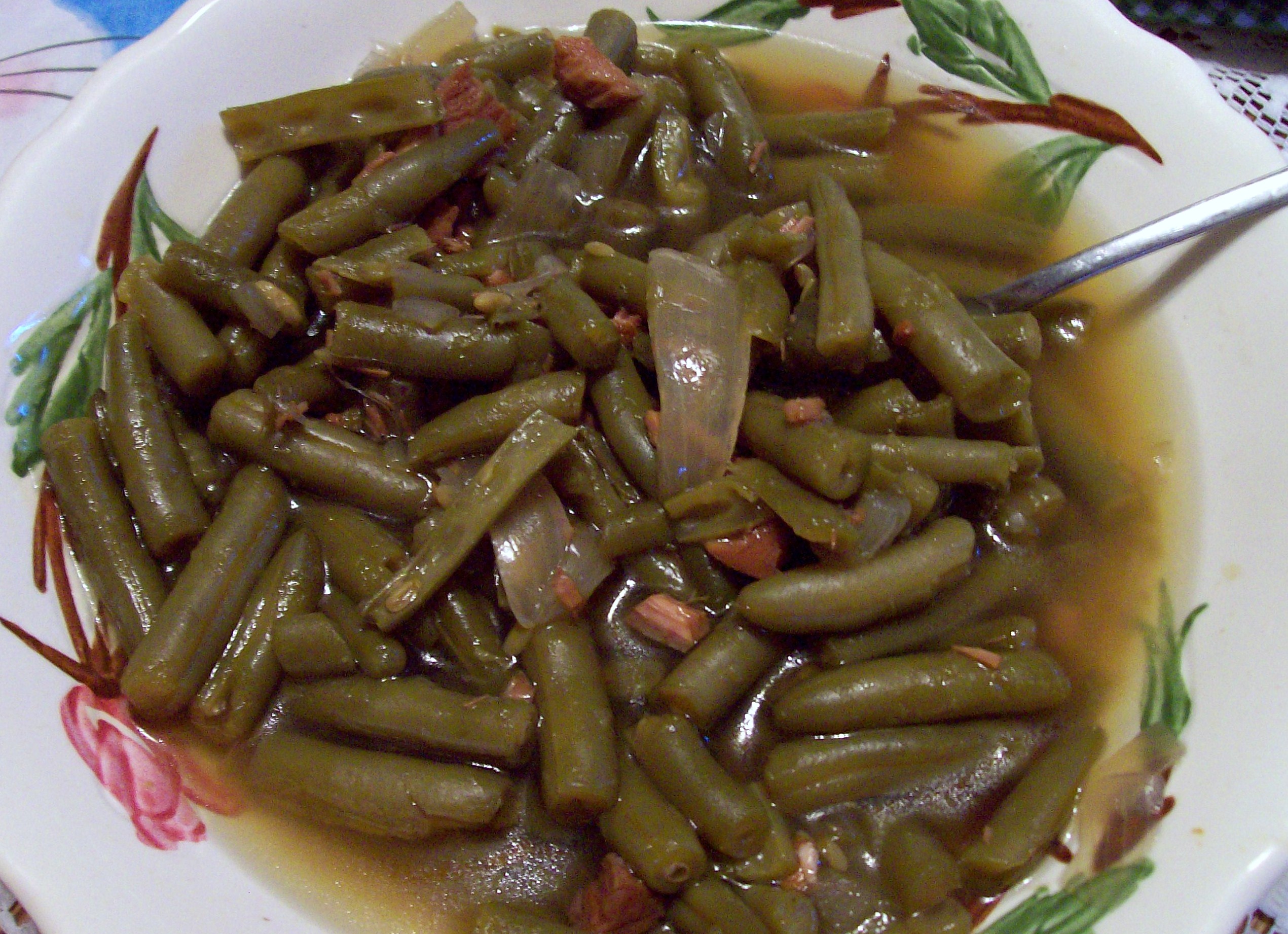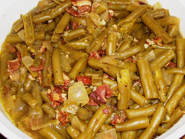 4 (14 1/2 ounce) cans green beans, drained 2 (14 ounce) cans chicken broth, seasoned with roasted garlic 1 onion, cleaned and cut into 6 wedges 1?2 lb bacon, cut into small pieces and semi fried bacon drippings salt, to taste pepper, to taste