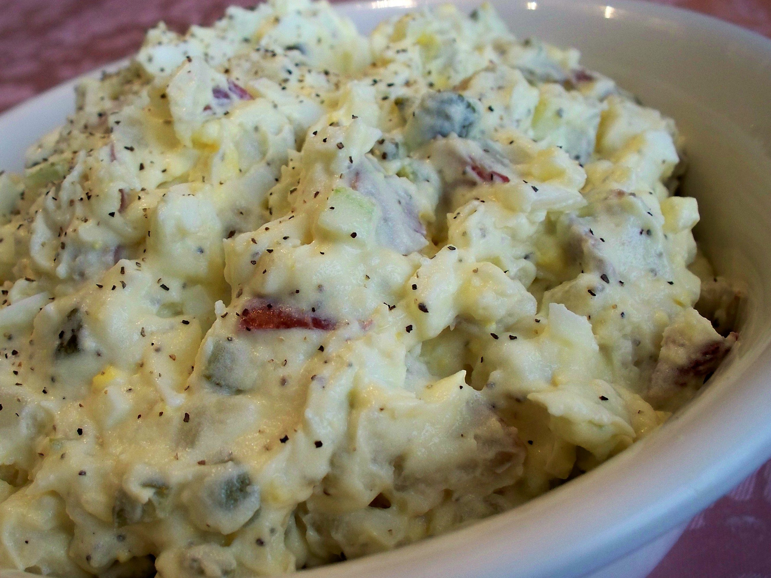5 lbs red potatoes, peeled, cubed, cooked 1 dozen hard-boiled egg, peeled and chopped 1 onion, chopped 1?2 cup dill pickle, chopped (or to your taste) 1 teaspoon celery seed 4 ounces sour cream 1 quart mayonnaise salt & pepper