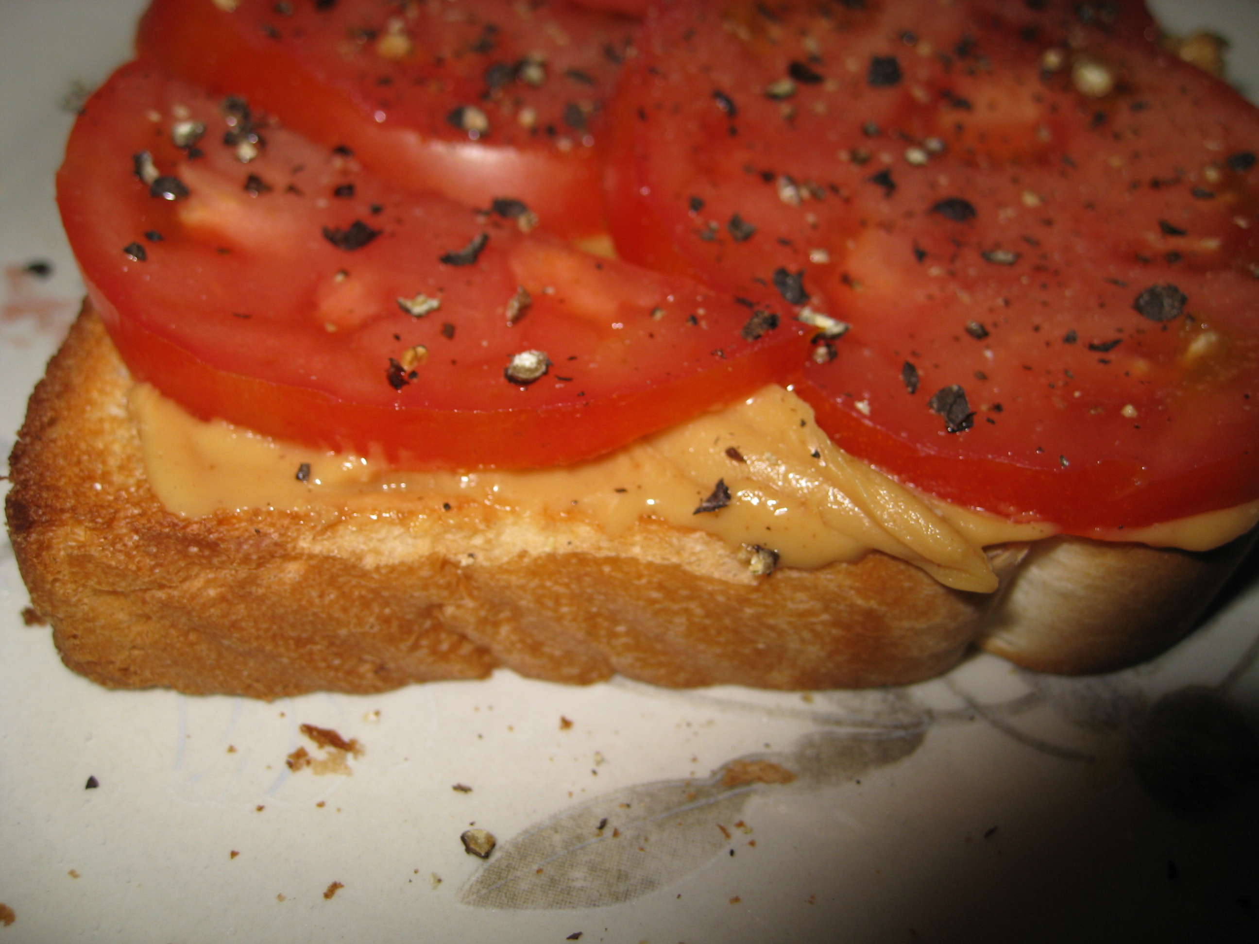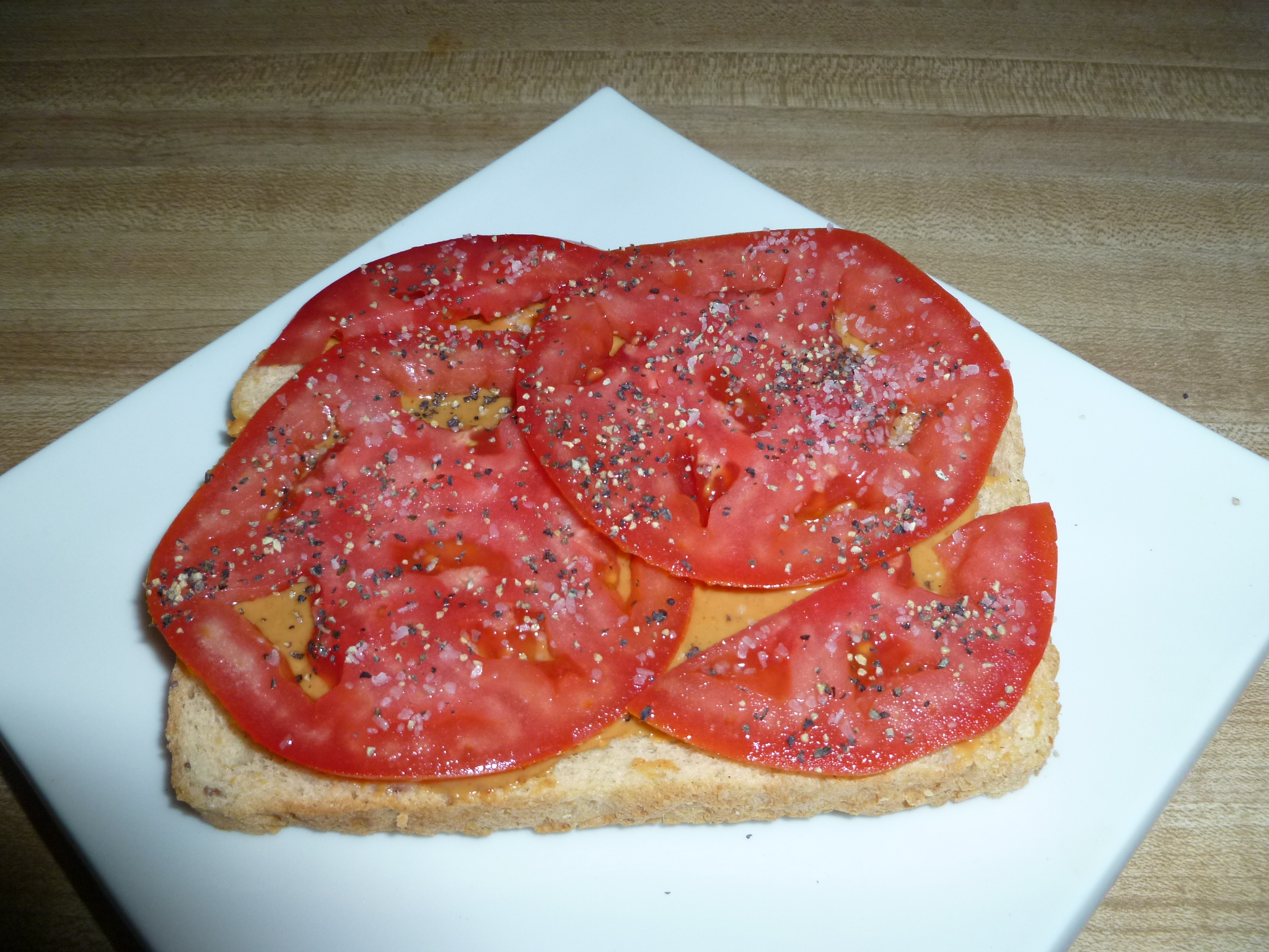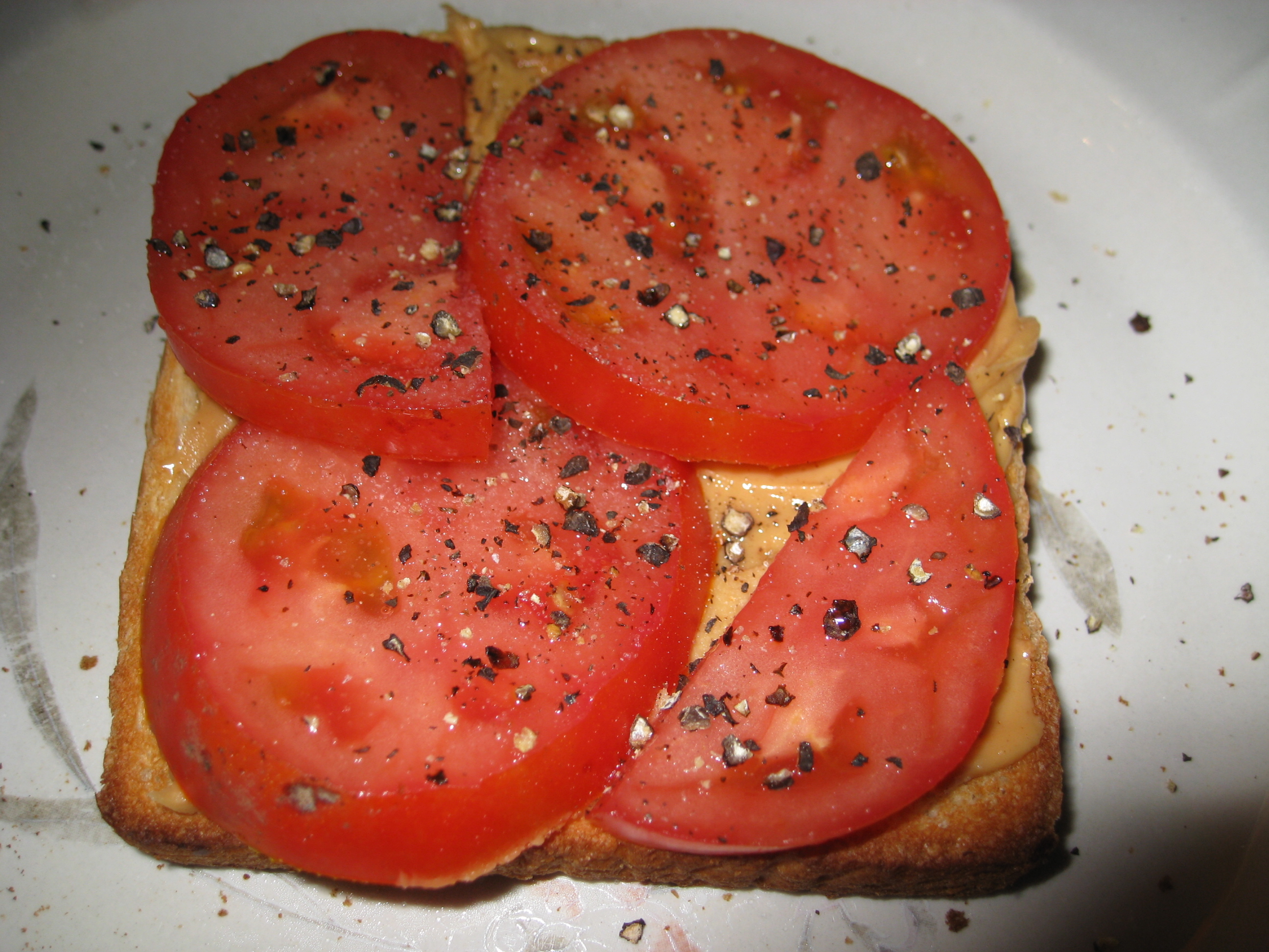Spread peanut butter on HOT toast. Concerned with calories-- You don't have to lay it on really thick, just make sure you can taste it. Now, completely cover the toast with tomato slices. Cut sliced tomatoes in halves or quarters, if necessary, to accomplish this task. Sprinkle liberally with black pepper, and add just a bit of salt, if desired. Eat while toast is still hot. If it gets cold, throw away and start over. Well, I'd probably eat it anyway, but it's not as good cold. Try it, you'll like it. Trust me on this-- the salty peanut butter is just wonderful with the tomatoes, and at least a little bit of pepper is necessary. I know, you're going EEEWWWWWW! But if you give it a shot, who knows-- Maybe this is how you can find your inner weirdo.