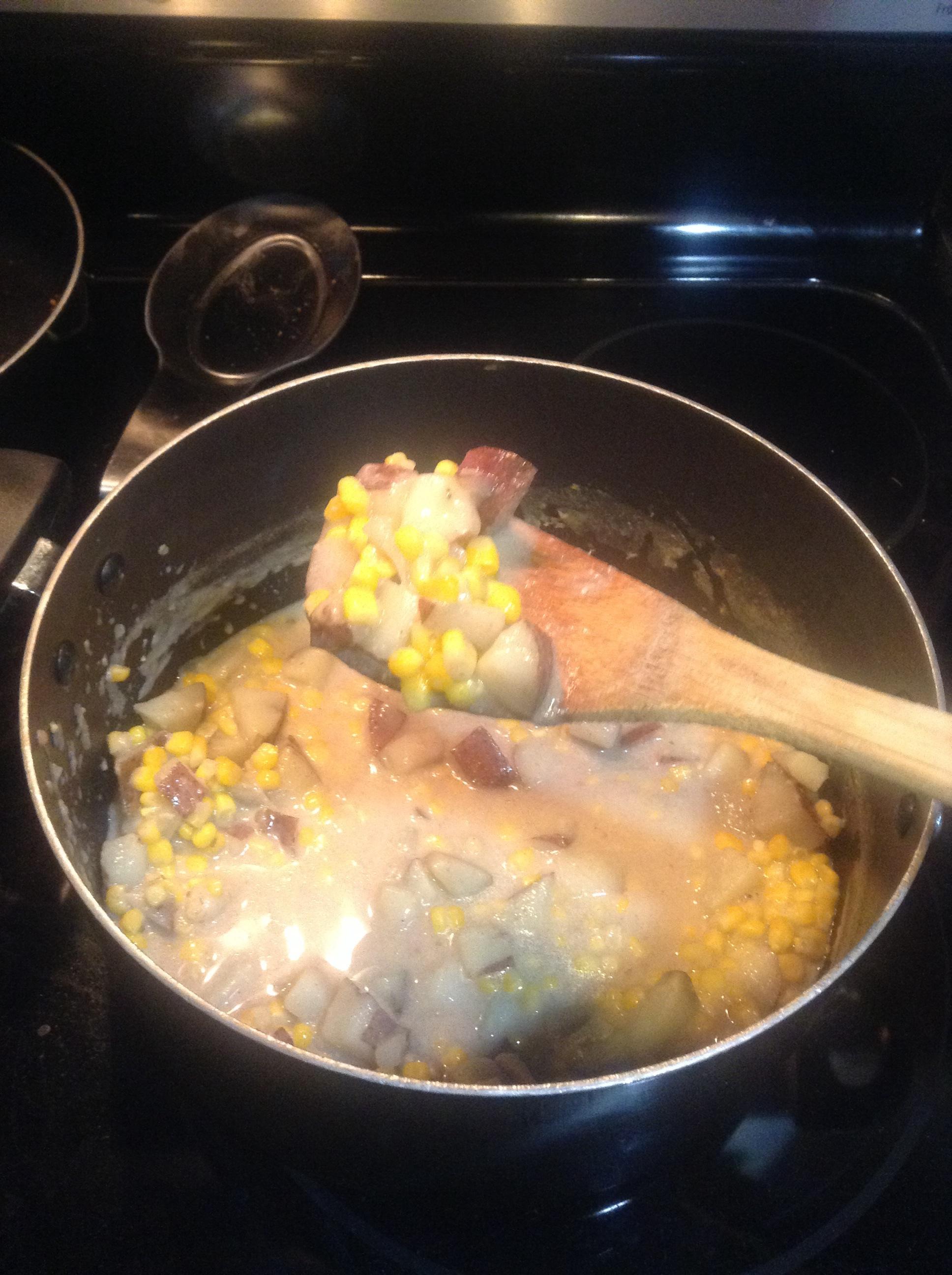 2 1?2 cups cooked corn (canned is fine) 2 cups diced potatoes 1 tablespoon butter 1?4 cup onion, diced 1?2 teaspoon salt 1?8 teaspoon pepper 1 1?2 cups boiling water 2 cups hot milk 1 tablespoon flour, mixed with 1 tablespoon water