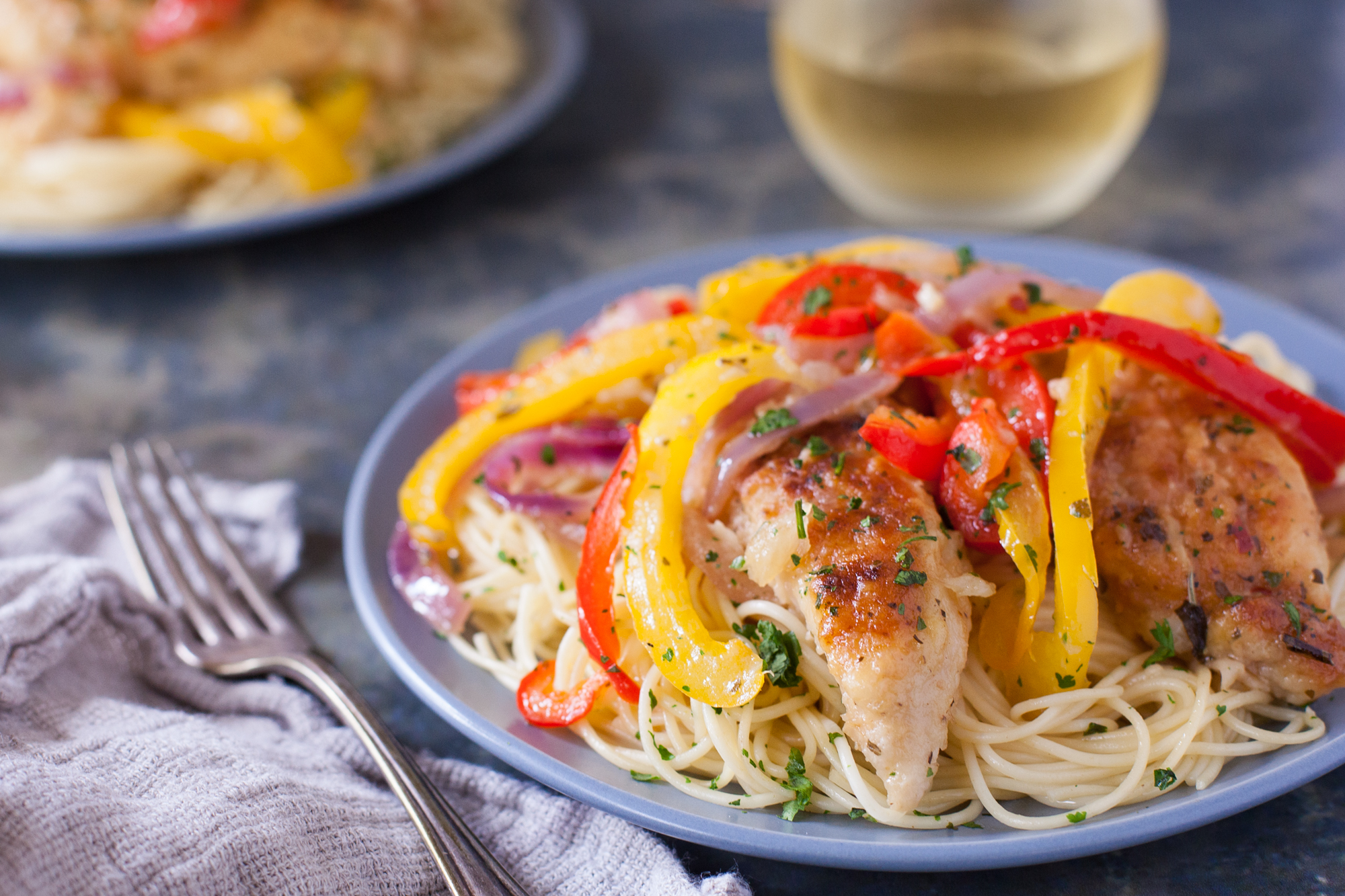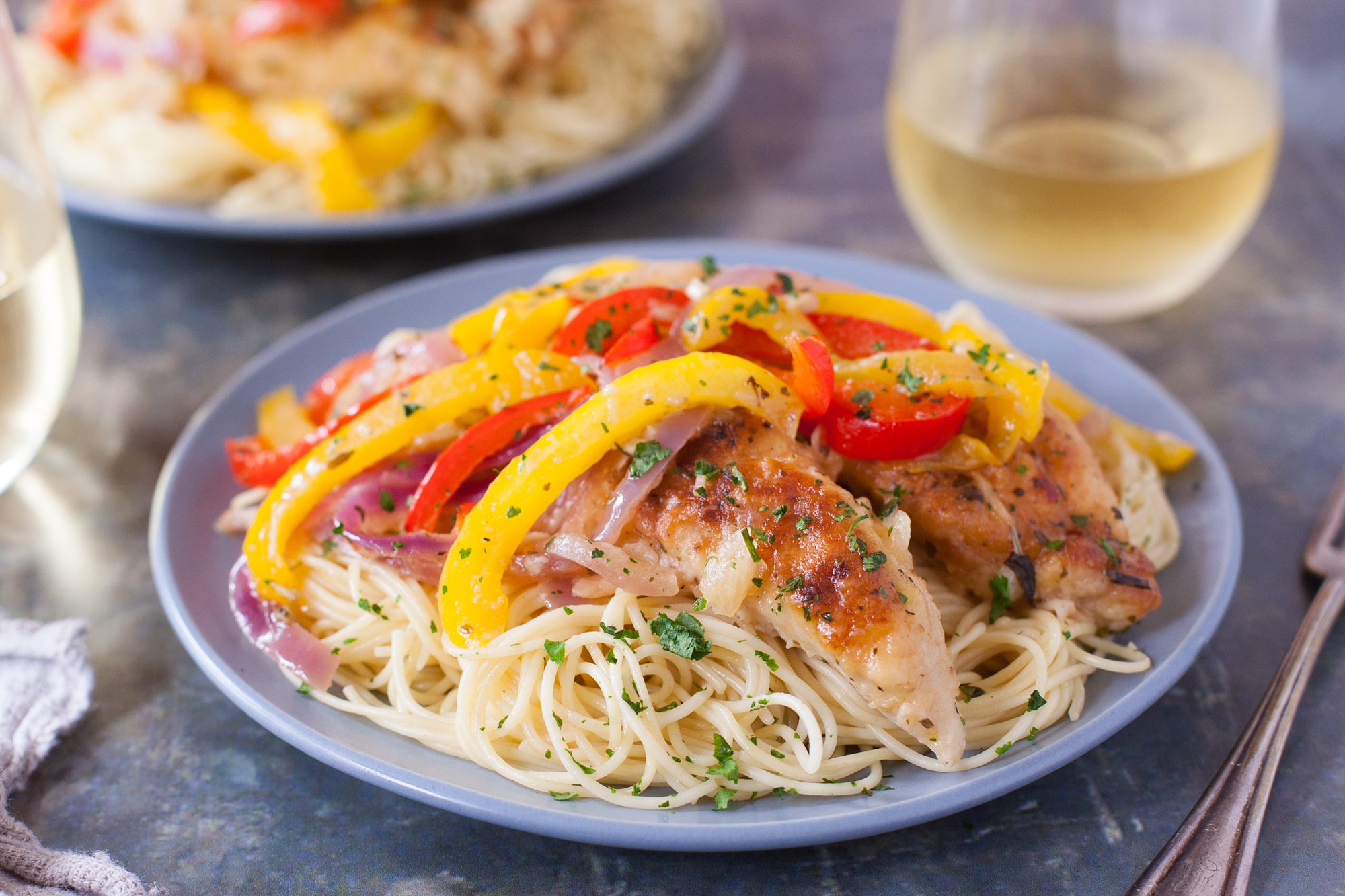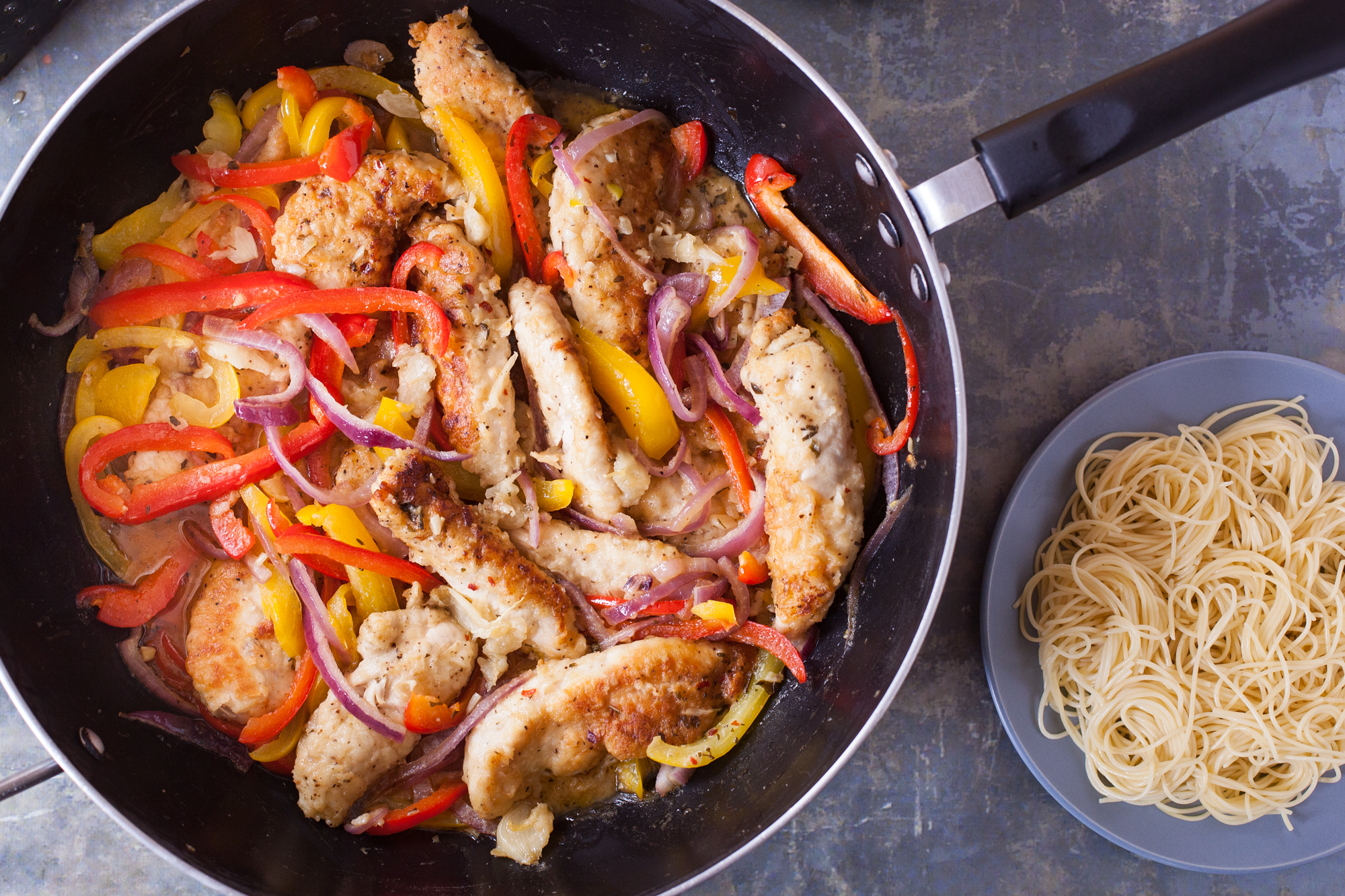 WHITE SAUCE 1 tablespoon butter 2 tablespoons flour 3?4 cup milk, hot SCAMPI SAUCE 3 tablespoons butter 2 tablespoons garlic, crushed 1?2 teaspoon crushed red pepper flakes 1 tablespoon dried cilantro (optional) 2 teaspoons italian seasoning black pepper 3?4 cup white wine 1 cup chicken broth REMAINING INGREDIENTS 1?2 lb angel hair pasta, cooked and drained 2 bell peppers, thinly sliced 1 red onion, thinly sliced 10 garlic cloves, roasted 2 chicken breasts, sliced olive oil