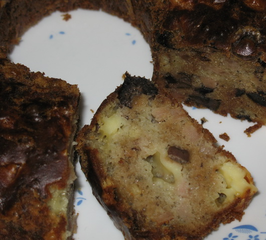4 eggs 1 2?3 cups plain white flour 2 1?2 teaspoons baking powder 1?3 cup olive oil 2 tablespoons butter, melted 1?2 cup dry white wine 1?4 cup port wine 1 1?2 cups pitted green olives or 1 1/2 cups pitted black olives 2 cups chopped ham 2 cups gruyere or 2 cups emmenthaler cheese salt pepper