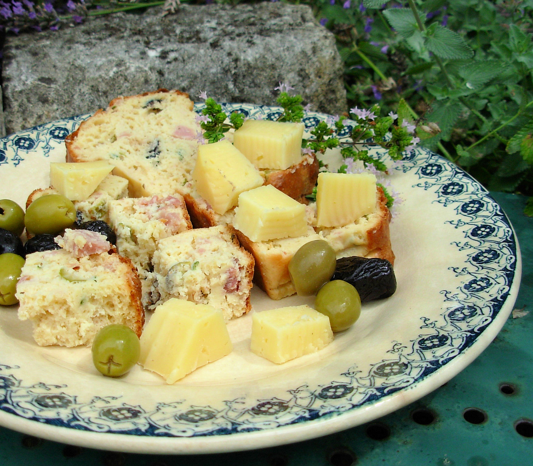 Heat oven to 200C or 400F. In a bowl beat the eggs until pale yellow and frothy. Stir in flour, baking powder, olive oil, melted butter, wine and port. Chop the ham, cube the cheese and slice the olives. Stir in ham, cheese, olives, salt and pepper to taste. Pour into greased bread tin, loaf tin or cake pan (11 X 4 inches would be a good size). Bake for about 50 minutes, or until well risen and golden brown. Serve cold in slices or as sandwich bread. This can be frozen in slices or as one whole loaf.