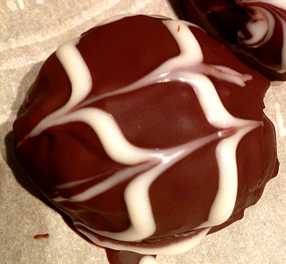 Using a food processor, grind cookies to a fine powder. With a mixer, blend cookie powder, cream cheese and vanilla extract until thoroughly mixed (there should be no white traces of cream cheese). Roll into small balls and place on wax-lined cookie sheet. Refrigerate for 45 minutes. Line two cookie sheets with wax paper. In double-boiler, melt milk chocolate. Dip balls and coat thoroughly. With slotted spoon, lift balls out of chocolate and let excess chocolate drip off. Place on wax-paper-lined cookie sheet. In separate double boiler, melt white chocolate. Using a fork, drizzle white chocolate over balls. Let cool. Store in airtight container, in refrigerator. Note: When I am exceedingly lazy (most often the case these days), I forego the chocolate 'dip' and merely roll my truffles into various mixtures - chopped nuts, chocolate sprinkles, vari-coloured candy sprinkles, cocoa powder, chocolate shavings, coloured sugars -- still pretty -- less work.