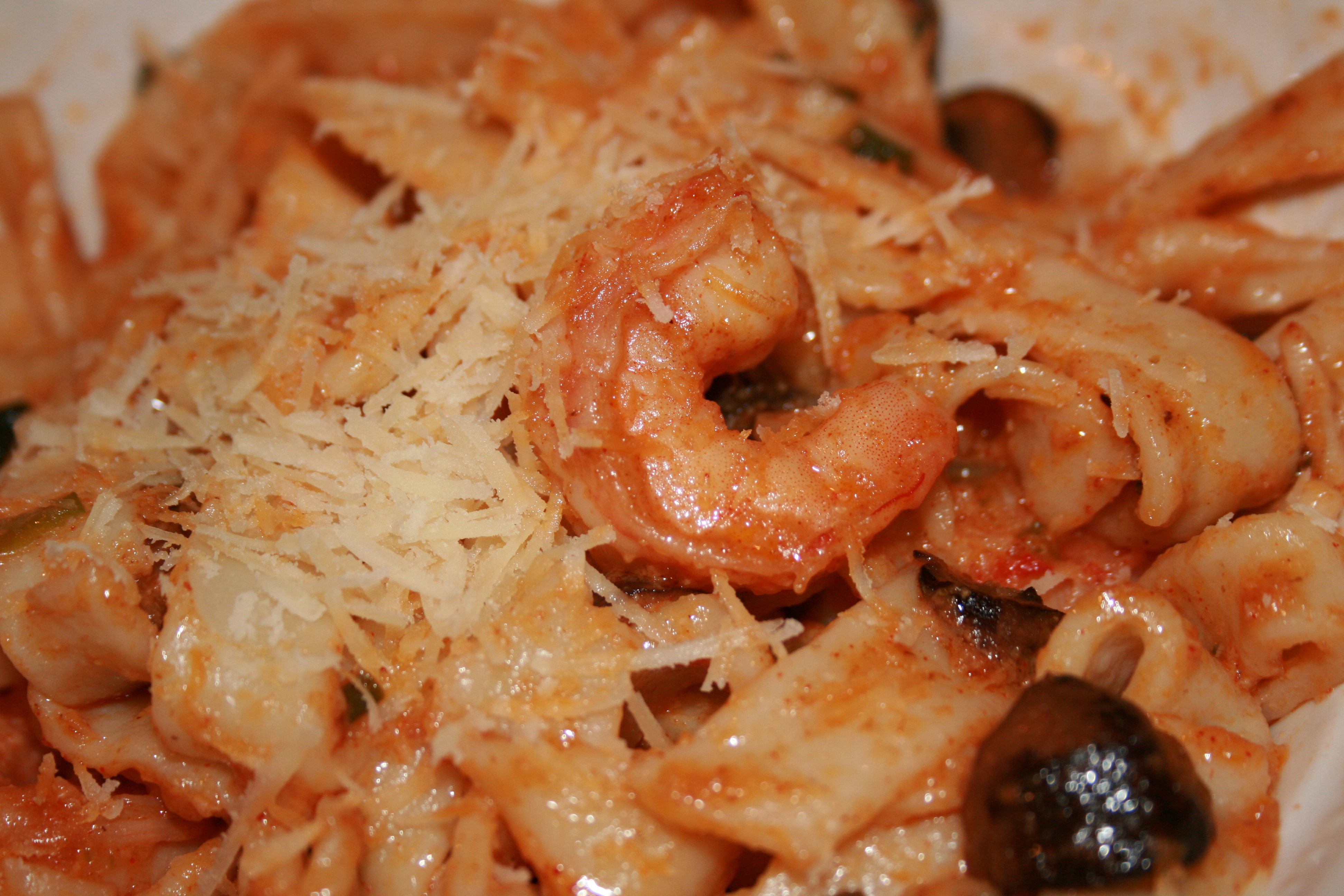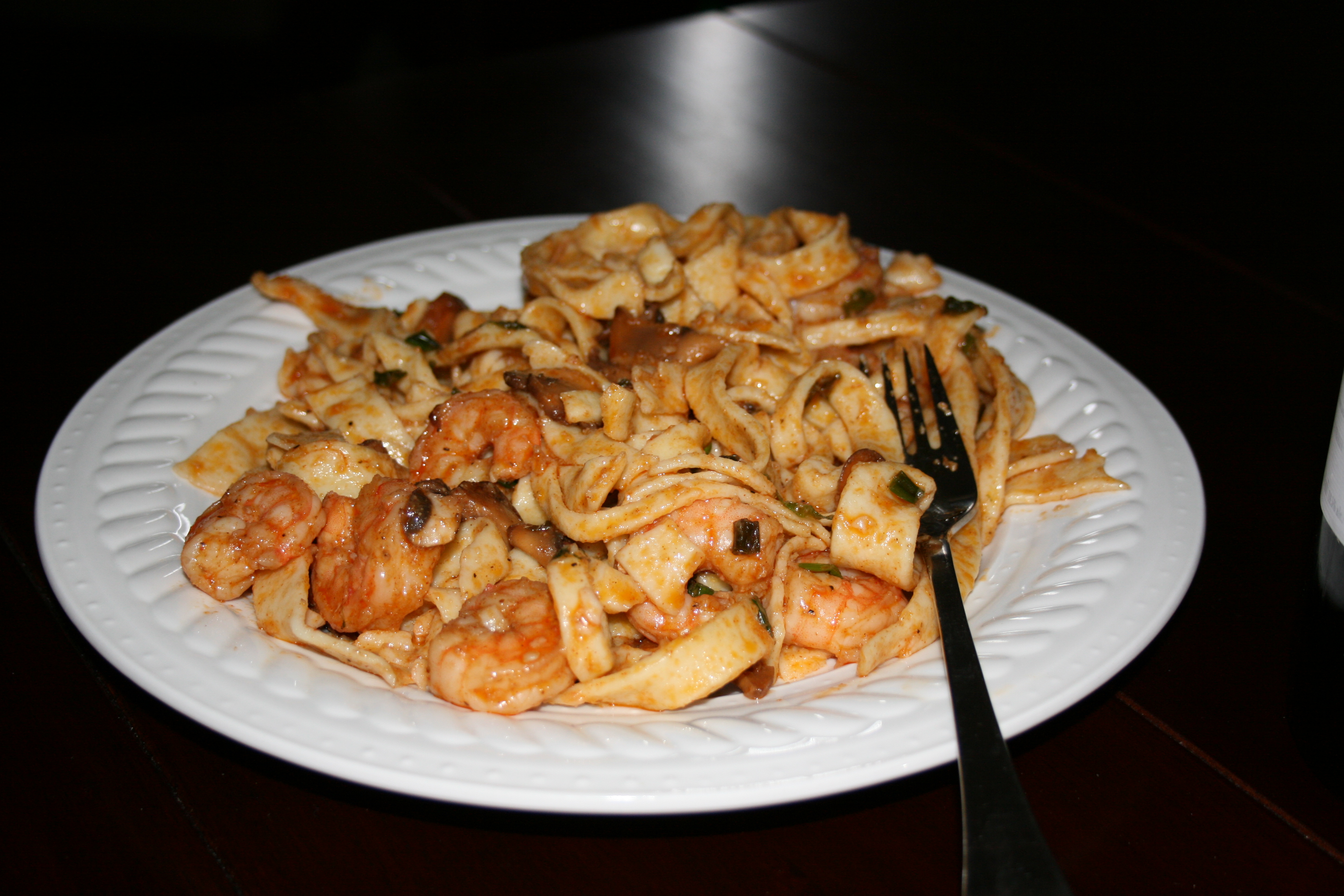 1?2 cup butter 1 1?2 cups heavy cream 1 tablespoon ketchup 1 teaspoon paprika 1 teaspoon garlic powder 3?4 teaspoon cayenne pepper (reduce to 1/4 tsp for light heat) 1?2 teaspoon onion powder 1?2 teaspoon salt 1?4 teaspoon coriander 1?4 teaspoon black pepper 2 cups quartered baby portabella mushrooms (Slice instead if they have the circumference of a golf ball or wider) 1 lb raw shrimp (tails off and de-veined, substitute 1/2 for crawfish if available) 1?2 cup chopped green onion (about 2-3) 16 ounces fettuccine pasta (I am guessing on the amount of pasta since I make two batches of Easy Homemade Fresh Pasta (Gluten Free)) shredded fresh parmesan cheese