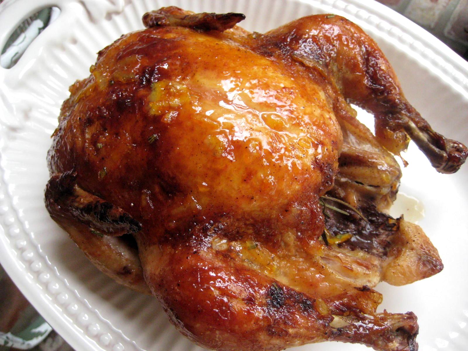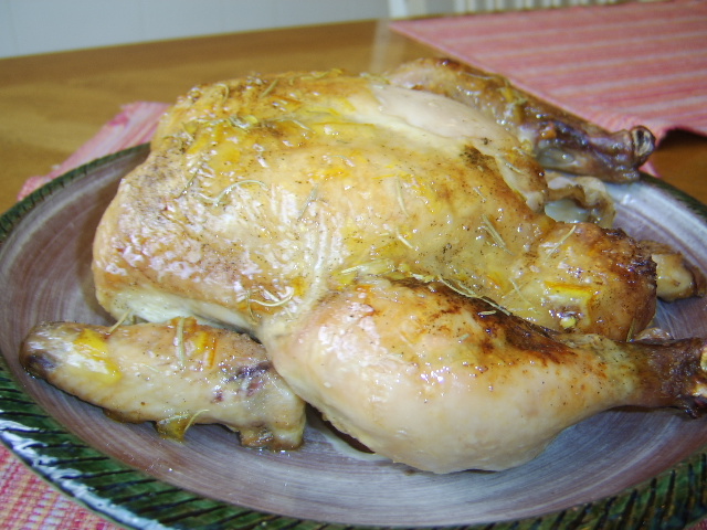 1 (3 lb) whole roasting chickens 1 tablespoon melted butter or 1 tablespoon olive oil 2 garlic cloves 1 large orange, peeled and quartered 1?2 cup orange juice 1?2 - 1 teaspoon salt, to taste 1?4 teaspoon pepper (I use freshly ground black pepper) 1?2 teaspoon dried rosemary GLAZE 3 tablespoons orange marmalade 1?2 teaspoon dried rosemary, to taste