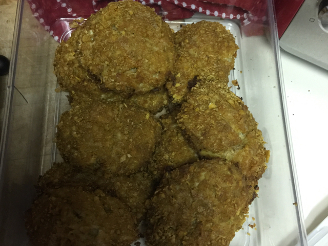 2 1?2 cups finely crushed corn flakes 1?4 cup mayonnaise 1 tablespoon spicy Dijon mustard 1 teaspoon Old Bay Seasoning 1?8 teaspoon cayenne pepper 1 egg yolk 1 lb fresh crabmeat 2 tablespoons soft butter